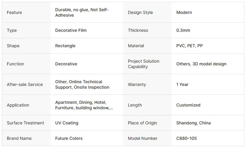 1.Decoritive: заманбап катуу түстүү блистан фильм бар, текстуралык көрүнүш жана күчтүү ортоңку. Ал заманбап, минималист жана скандина сыяктуу ар кандай декоративдик стилдерге ылайыкташтырылышы мүмкүн. Жаныбарлар менен ашканалар сыяктуу кичинекей боштуктарга ылайыктуу. Кошумча үлгүлөрдөн, катуу түстүү блистан фильмден кийлигишпестен, "мейкиндикти кеңейтүү". Мындан тышкары, ар кандай катуу түстөрдүн айкалышы иерархия (мисалы, Ак Кабинетдик денелер + боз эшик панелдерин) сезе алат.