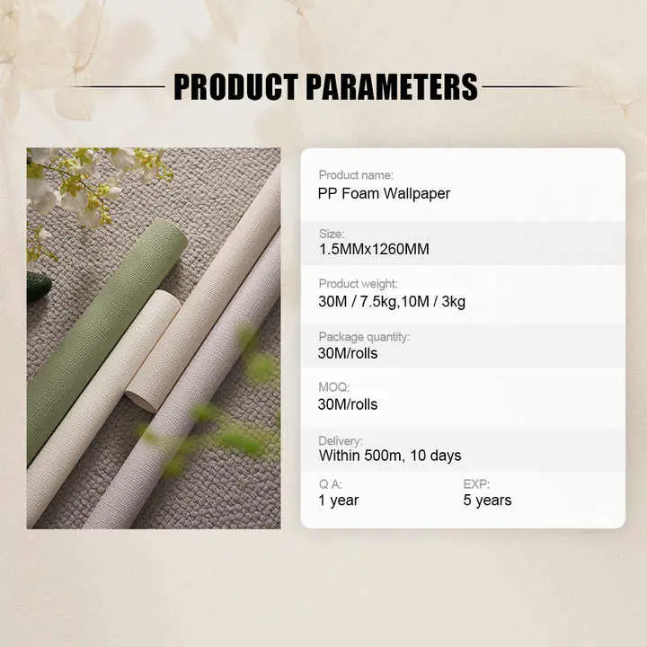 Суусуз жана суу туруктуу материал: биздин пп көбүк обои, бул сапаттуу полпропилен материалынан оолак болуп, аны ар кандай чөйрөлөрдө жана жылуулуктарга, үй чарбаларына, соода жана административдик мейкиндиктерди колдонууга алып келген.